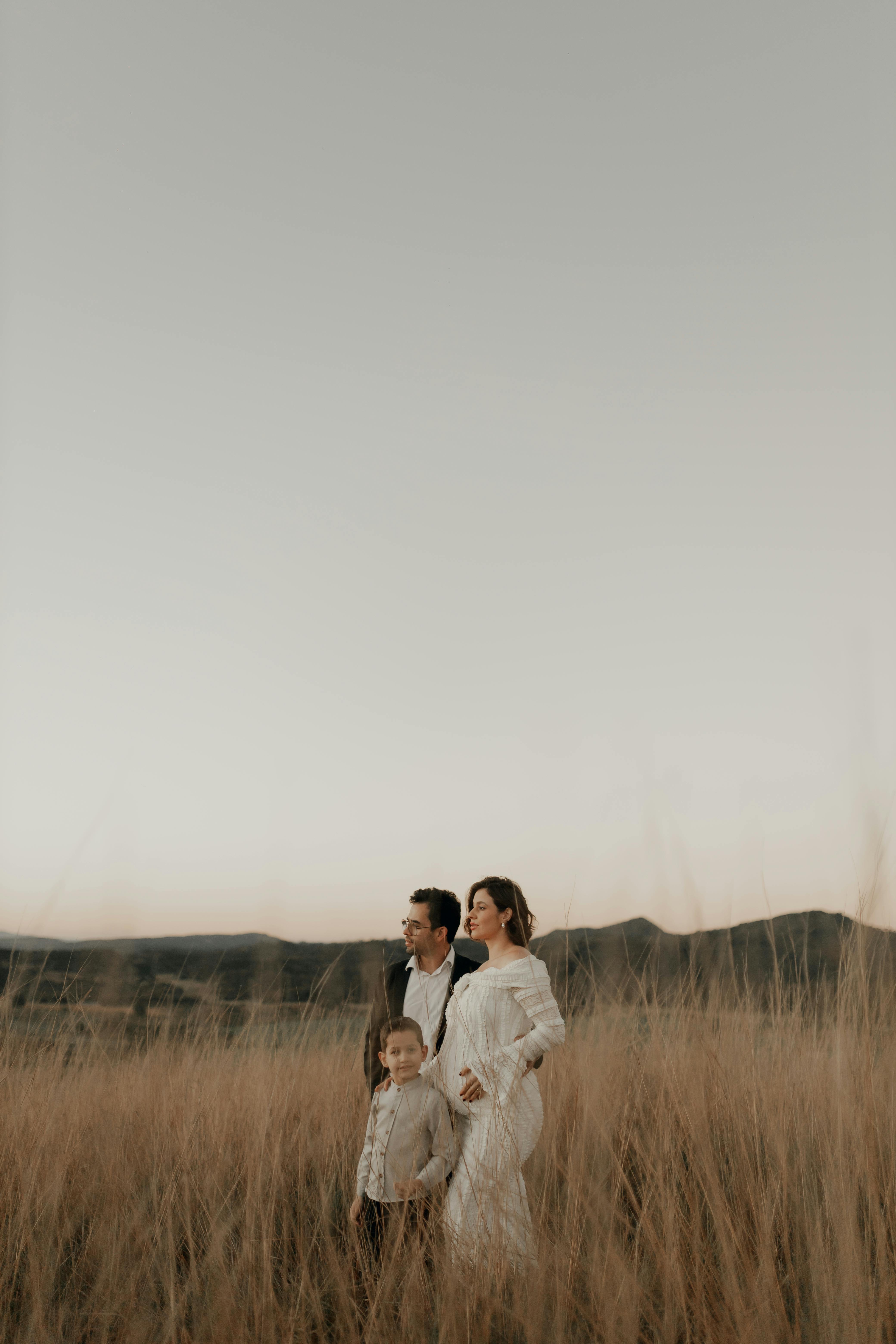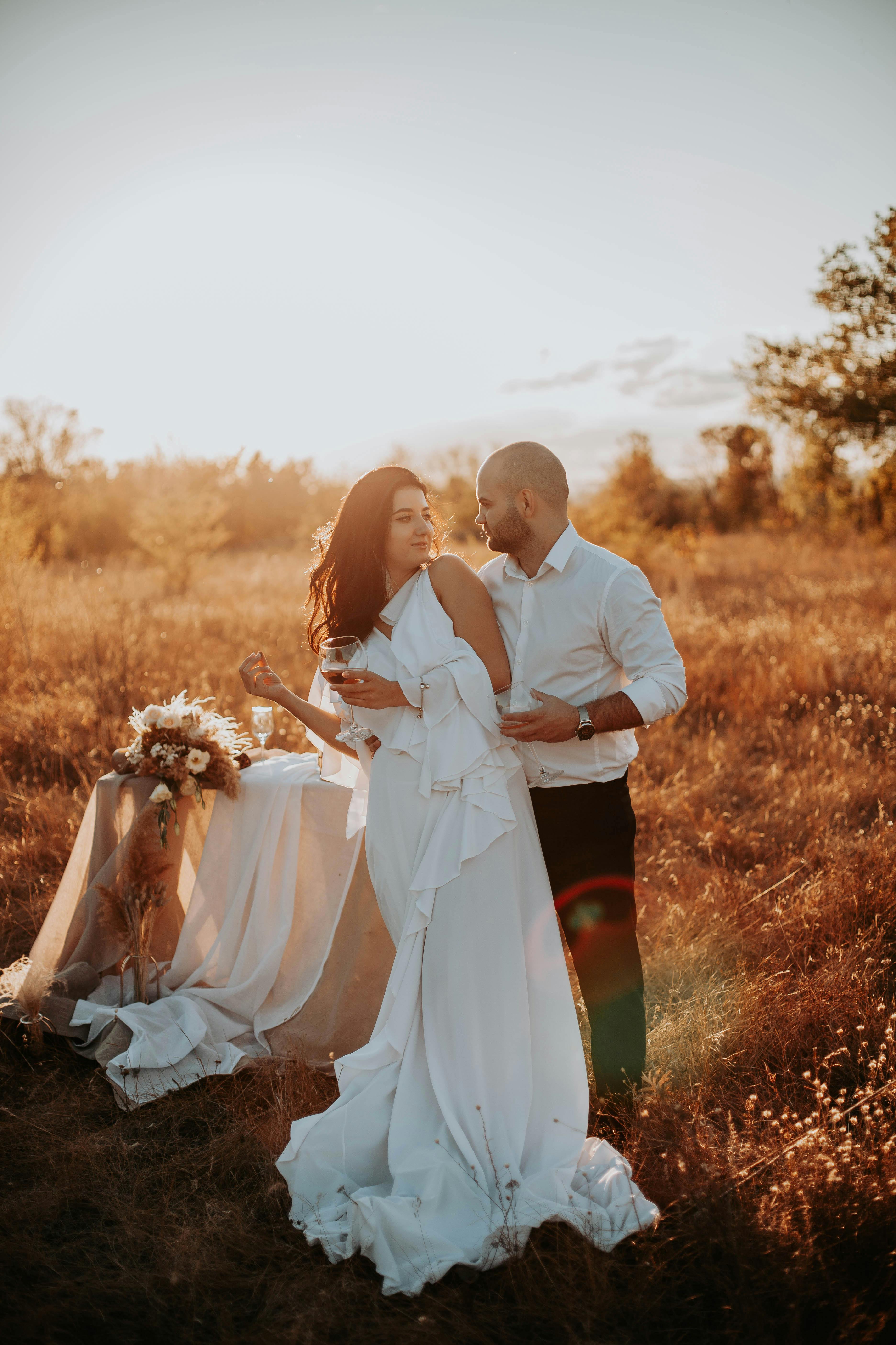 一對夫婦站在山上穿白色連衣裙